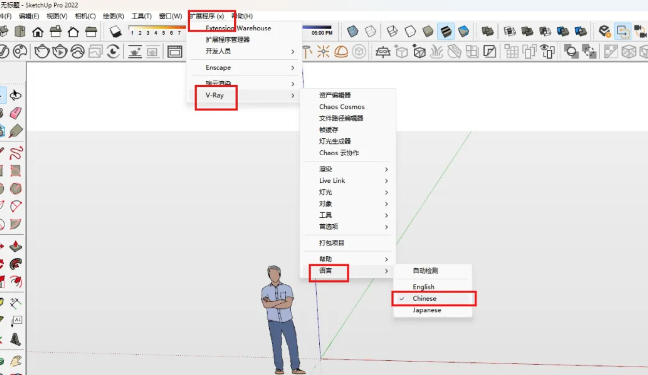 11、打开SketchUp,启动VRay后如果不是中文,在SketchUp界面点击扩展程序——V-Ray——语言——选择Chinese。然后重启SketchUp,打开后就是中文版本了。