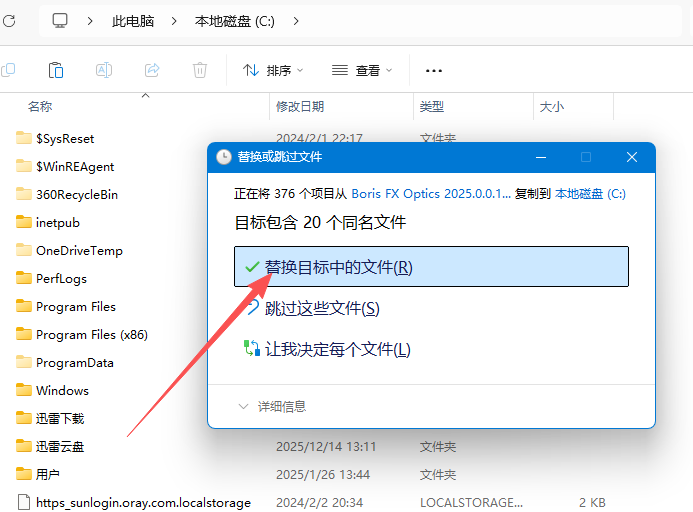 11、黏贴 第10步复制的文件夹到C盘根目录,黏贴,点击 替换目标中搞得文件;