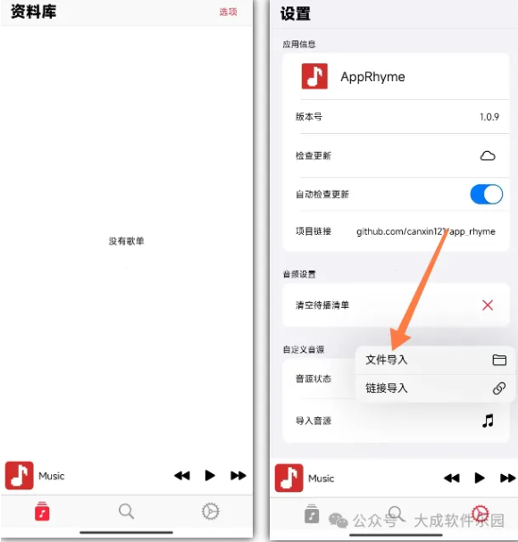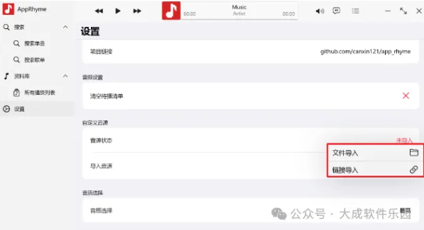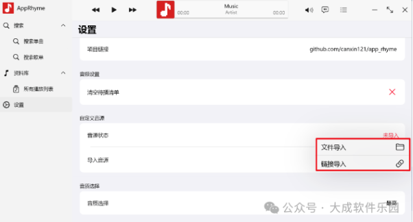 安装软件后看似空空如也,别担心!在【设置】中找到 “自定义音源”,通过 “导入音源” - “文件导入”,导入文末提供的音源,即可开启音乐之旅。搜索想听的歌曲,双击在线听,加入歌单下载,轻松搞定。