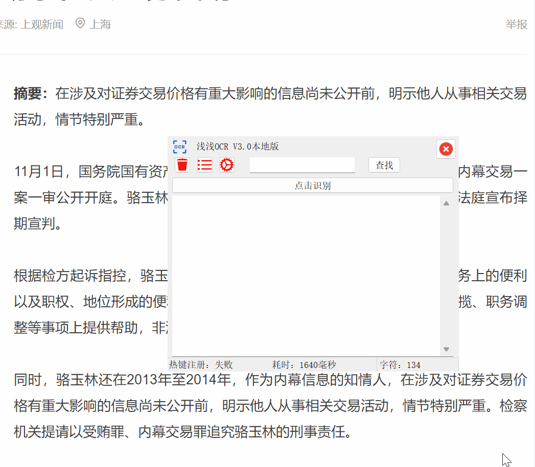 它的功能极其简洁,只有 OCR 识别这一个核心功能,没有任何冗余的选项,操作起来那叫一个简单。只需点击【点击识别】或者按下 “F8”,然后框选要识别的区域,短短几秒钟就能给出准确的识别结果。