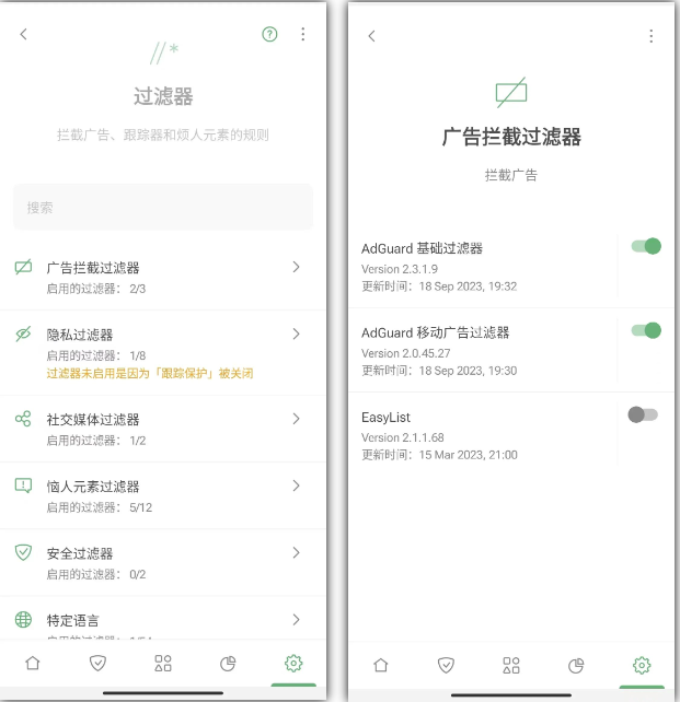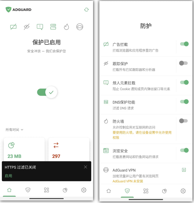 Ad Guard是安卓端的广告拦截软件。首次使用时,要开启保护,开启后在防护中可设置防护内容,按需开启或关闭相应选项即可。