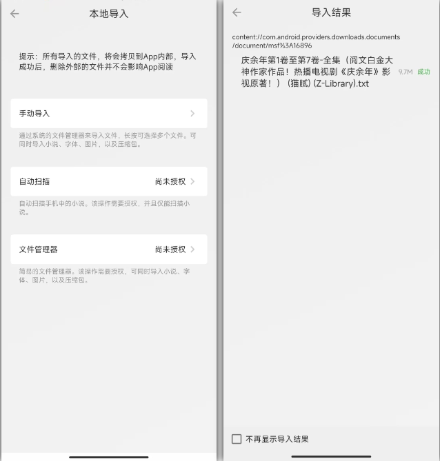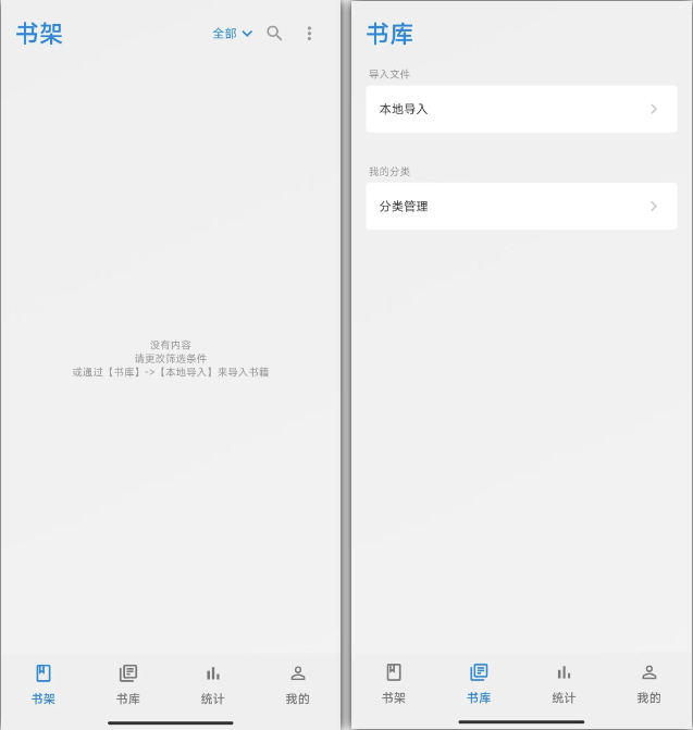 安装完 Readingo 后,您会发现里面没有内置小说。别担心,只需手动导入就行。进入 “书库”,选择 “本地导入” 里的 “手动导入”,然后挑出您手机里的小说就能成功导入。