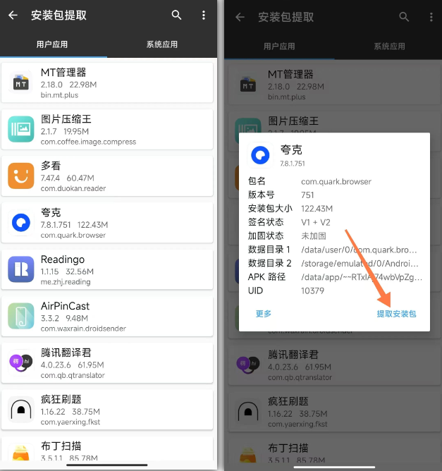 它还有 APK 提取功能,您只要点击想要提取的应用程序,然后点击【提取安装包】就大功告成。