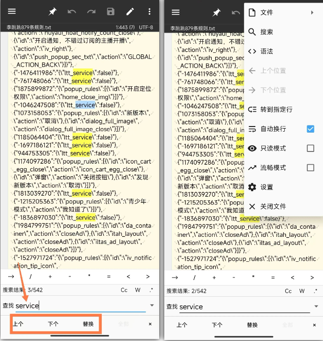 文本查看和编辑也不在话下,支持文本内容搜索,搜索后能查看 “上个” 和 “下个”,还能替换文本内容。而且软件还有语法功能,能转到指定行,还能设置自动换行、只读模式等。