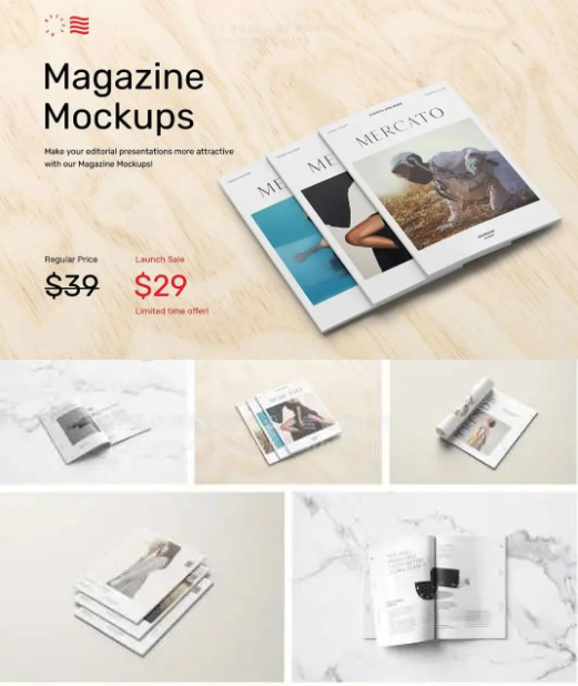 选择合适尺寸的样机:主要有A4、美国标准、方形或横向尺寸等4种尺寸杂志模型。