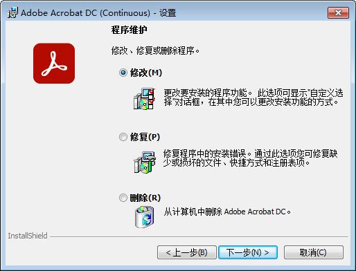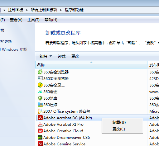 1.打开 控制面板→程序和功能,选中Acrobat→右键→“更改”(不是卸载,是更改)。如下图: