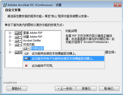 3.点开“可选功能”前的+,点击“印前检查”前的三角符号,选择“此功能及所有子功能将安装在本地硬盘驱动器上。”或直接点击“可选功能”前的三角符号,选择“此功能及所有子功能将安装在本地硬盘驱动器上。”,然后点“安装”,待安装完成后即可解决。如下图: