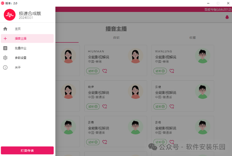 🎭主播切换与关注🎭:在界面右侧,你可以轻松切换不同的主播声音,还可以在软件设置中添加新的主播,进行试听和收藏,让你的创作更加丰富多彩。