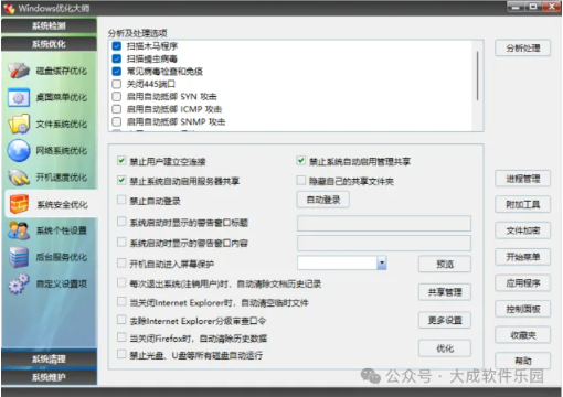 其中在系统安全优化功能里,右边栏还有进程管理、附加工具、文件加密、开始菜单、应用程序等等,这些小功能也相当实用。