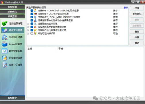 系统清理:系统清理属于刚需,包含注册表清理、磁盘文件管理、冗余DLL清理等等。比如注册表信息清理,可以扫描出系统里的冗余信息、无效的软件信息、错误信息等等。